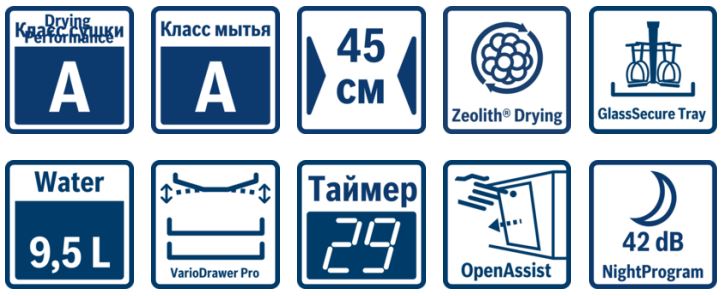 Перечень программ :Авто +, Авто 45-65°C, Авто бережная, Ночная программа, Эко