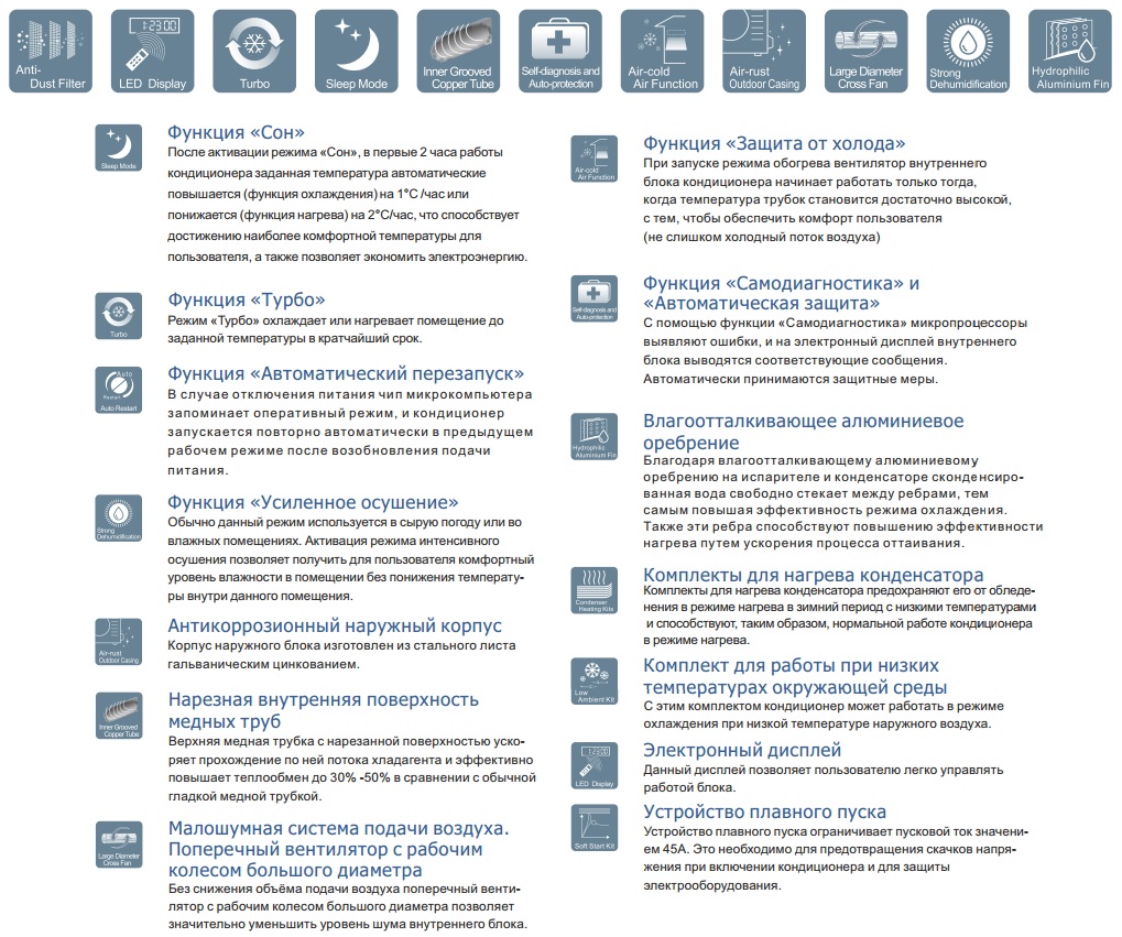 | Дополнительные режимы | ночной режим / турбо режим / режим вентиляции / автоматический режим / ионизация воздуха / режим осушения |