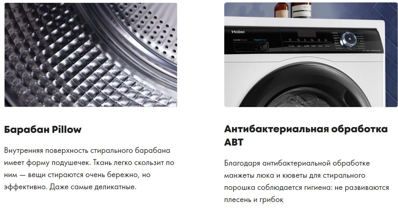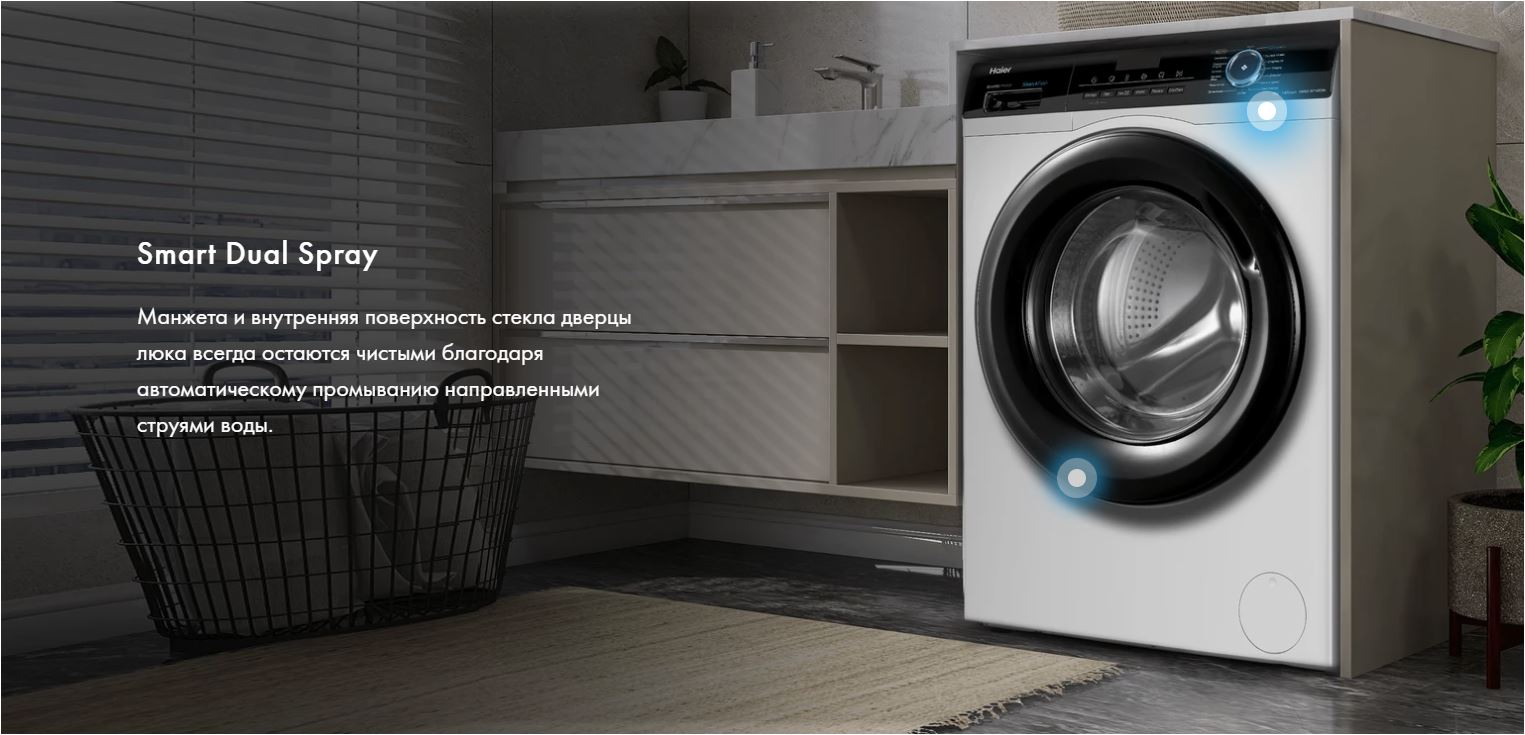 Haier HW90-BP14929A — полноразмерная стиральная машина с загрузкой до 9 кг и скоростью вращения барабана до 1400 об/мин. Внутри установлен инверторный мотор с максимальным классом энергоэффективности А+++. Гарантия на мотор — 12 лет, это говорит о его надежности.