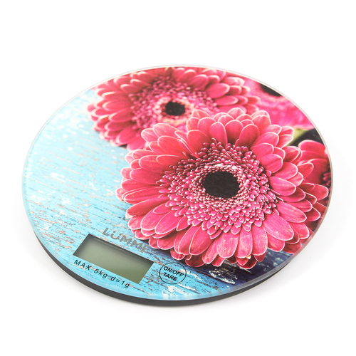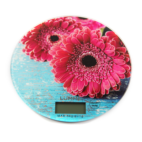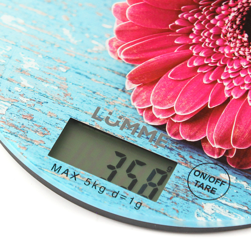 Яркие кухонные весы LUMME LU-1341 Весы розовая гербера с красивой и прочной поверхностью из закаленного стекла, большим жидкокристаллическим дисплеем, функцией «ТАРА». Весы обеспечивают надежное взвешивание продуктов массой до 5 килограммов с точностью до 1 грамма и способны работать в различных единицах измерения (граммы, килограммы, унции, фунты, миллилитры).