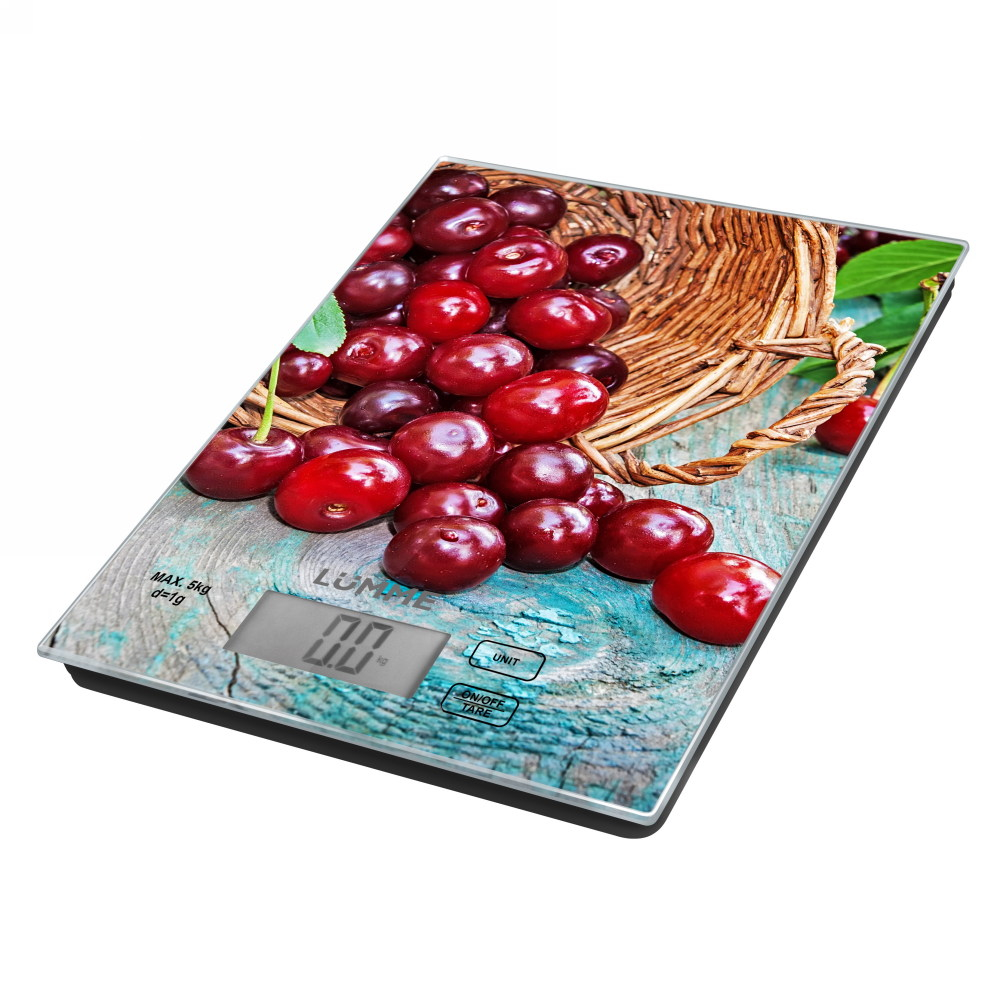 Яркие кухонные весы LUMME LU-1342 Весы садовая вишня с красивой и прочной поверхностью из закаленного стекла, большим жидкокристаллическим дисплеем, функцией «ТАРА». Весы обеспечивают надежное взвешивание продуктов массой до 5 килограммов с точностью до 1 грамма и способны работать в различных единицах измерения (граммы, килограммы, унции, фунты, миллилитры).