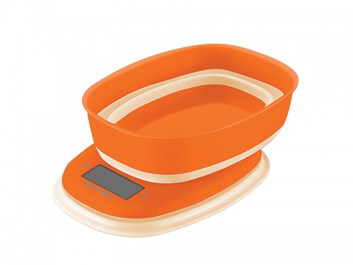 Кухонные электронные весы с чашей для взвешивания различных продуктов весом от 2 граммов до 5 килограмм идеально подойдут для любой кухни. Особенности конструкции: складывающаяся чаша, позволяют хранить весы в любом небольшом кухонном шкафчике. Модель представлена в двух цветах: в красном и d оранжевом.