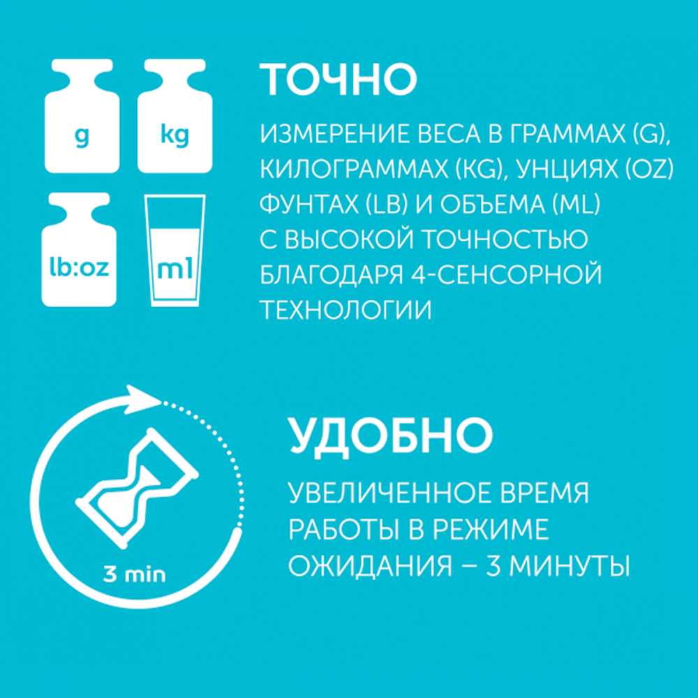 Весы могут измерять не только вес продуктов, но и объём воды или молока – для выбора этого режима достаточно нажать кнопку на тыльной стороне весов. Функция последовательного взвешивания облегчает приготовление блюд со сложными рецептами.