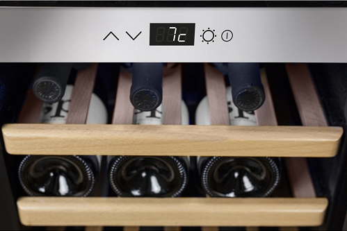 Шесть съемных полок из дерева предназначены для правильного хранения вина: бутылки кладутся горизонтально (вместительность – 24 бутылки). Управление осуществляется при помощи двух сенсорных панелей внутри холодильника.
