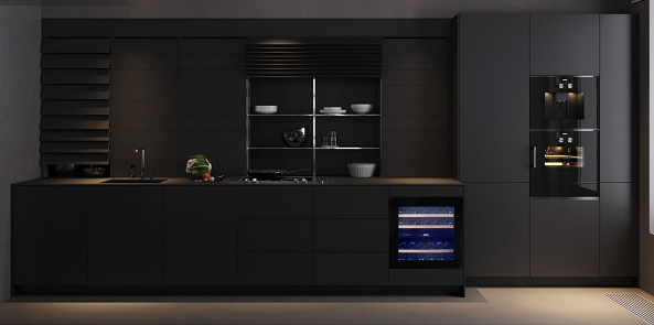 Лаконичный дизайн шкафа придаёт интерьеру современный вид. Чёрный корпус и рамка из бесшовной нержавеющей стали добавляют элегантности и солидности. В этой модели использовано панорамное освещение синего, янтарного и белого цвета, которое обеспечивает равномерную подсветку всех полок. (Освещение плавно включается при открывании дверцы, а через пару секунд после закрытия плавно гаснет.) Дополнительно у данной модели шкафа предусмотрен демонстрационный режим, во время которого освещение не гаснет. Такая функция помогает демонстрировать винную коллекцию Вашим друзьям и близким.