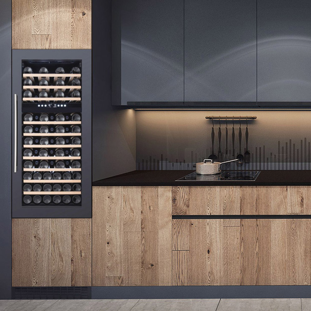 Добавили мы и немного уникальности к данной модели. Разработали две, полностью настраиваемые температурные зоны. Теперь можно одновременно, в одном месте хранить разные сорта вин. Но стоит учесть определенные моменты, что не рекомендуется устанавливать в нижней зоне температуру выше, чем в верхней зоне! Данная модель предназначена только для встраивания.